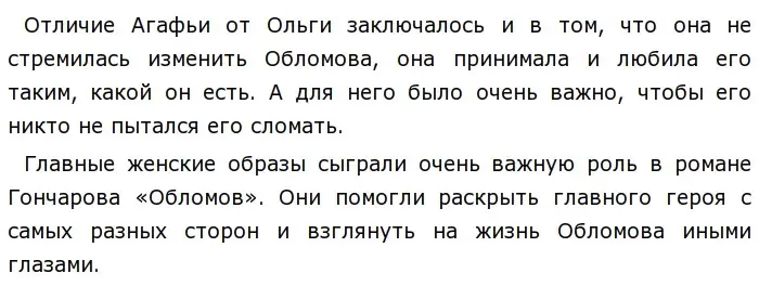 В романе И.А.Гончарова «Обломов» фигурируют два женских образа-Ольга Ильинская и Агафья Пшеницына. Автор проводит между героинями параллель и сравнивает их между собой. Обе женщины были влюблены в Обломова, но эта любовь у каждой из них носила разный характер. И именно эта разность чувств очень повлияла на судьбу главного героя.