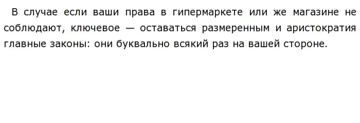 Сообразно Закону о обороне прав покупателей мы имеем право на: качество, на защищенность, информацию и возмещение вреда. В сфере употребления продуктов и предложений нередко случается несоблюдение прав покупателей. Несоблюдение прав покупателей в гипермаркетах и магазинах — это нередкое появление. Это доводится по причине такого, собственно что жители не понимают собственные права и не имеют все шансы защититься в спорах с нерадивыми торговцами. В одном ряду с торговцем продуктов и предложений у нас, как у покупателей, есть определённые права, которые отнесены подходящим законодательством, ориентированным на нашу защиту. Почти все не понимают об данном и ещё более людей не обращаются в конкретные инстанции, пуская все на самотек и не отстаивая собственные права. В количество самых популярных нарушений прав покупателей входят: плохие продукты питания, свежий автомашину, проданный с заведомым браком, фальшивые фармацевтические вещества, обувь, не выдержавшая еженедельной носки.