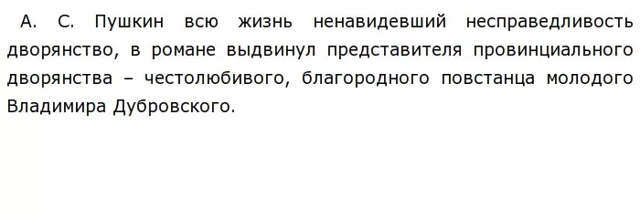 "Благородный разбойник" грабил только «известных богачей, но и тут делился с ними, а не грабил дочиста». Так же он не стал мстить Троекурову за его самодурство, которое приводит к смерти А. Г. Дубровского, ради Марьи Кириловны, в которою он был влюблён. Марью Кириловну Троекурову можно считать благородным героем. Она пришла на назначенное место Дефоржом, понимая, что дворянка не может идти на свидание с учителем. Она не предала Дубровского и до конца наделась на его спасение. Так же А. Г. Дубровского и всех его придворных я считаю благородными. А Кирила Петрович Троекуров, по моему мнению, неблагородный из-за своенравного характера. Князь Верейский неблагородный человек, потому что он не любил Марью Кириловну, но не выполнил её просьбу и показал письмо Троекурову. Шабашкина и дворовых Троекурова я считаю тоже неблагородными.