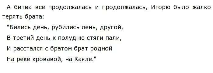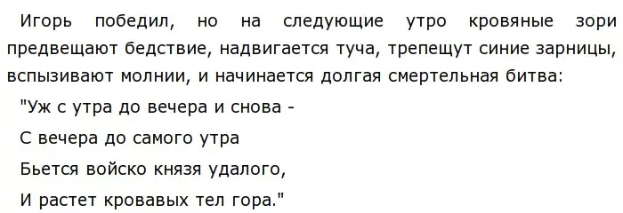 Исход битвы был печален: князя Игоря взяли в плен, русское войско потерпело поражение. Но несмотря на свои раны и боль, Игорь сбежал из плена, вернулся на Годину, где был встречен с почестями, как герой.
