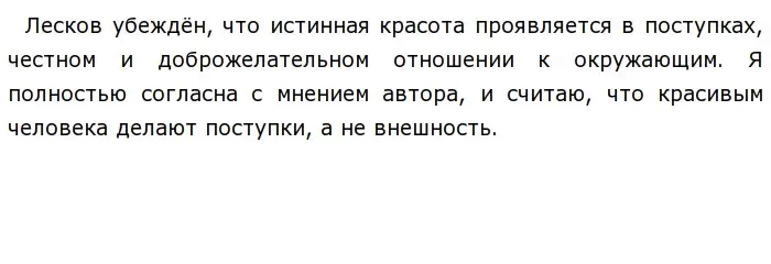 В данном тексте известный русский писатель Н. С. Лесков рассуждает над проблемой проявления внутренней красоты человека.