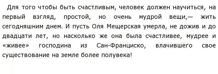 В отличие от остальных рассказов, «Лёгкое дыхание» показывает Олю Мещерскую в самых ярких красках. Характер и темперамент Мещерской отличается ветреностью, легковесностью. Девушка любит шалости и легко относится к жизни, её поведение раскованное, свободное. Оля, прожив яркую и насыщенную жизнь, умирает в юном возрасте, но автор подчеркивает, что её существование было не напрасно, что противопоставляется жизни Господина из Сан-Франциско.