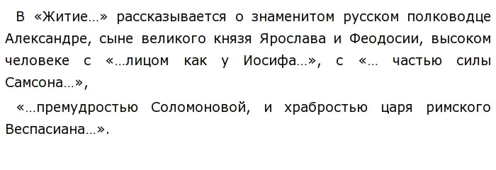 Автор описывает Александра Невского, как славного правителя, живущего по христианским заповедям; мудрого праведника, не имеющего грехов; человека высокой духовности, у которого нравственные интересы выше материальных. А кто же такой — праведник и защитник? Я думаю, что праведник — это человек высоких моральных ценностей, верующий и радеющий за веру. А защитник — тот, кто охраняет, оберегает, заступается и ограждает все то, чем дорожит от всяческих напастей. Александр Невский прожил не только праведную, а еще и наполненную храбростью жизнь. Казалось бы, зачем в названии произведения нужен союз «и» между словами: житие и храбрость? А за тем, что не каждый человек, живя, ведёт себя бесстрашно, как великий князь, который «… пошел на врагов в малой дружине… не дожидаясь, когда соберётся вся сила его, но крепко веря в помощь святых мучеников Бориса и Глеба». Также князь Александр был верен своему народу и отечеству, что подтверждается главными сражениями, выигранными им — это битва на Неве со шведами в тысяча вести сороковом году и Ледовое побоище с немецкими рыцарями на Чудском озере в тысяча двести сорок втором году. И даже в таких суровых и тяжелых испытаниях Александр оставался мудрым, милосердным, но непобедимым полководцем, не дающим волю эмоциям. Ведь даже с пленными он обращался как с людьми, а не как с животными, как это делали все остальные правители.