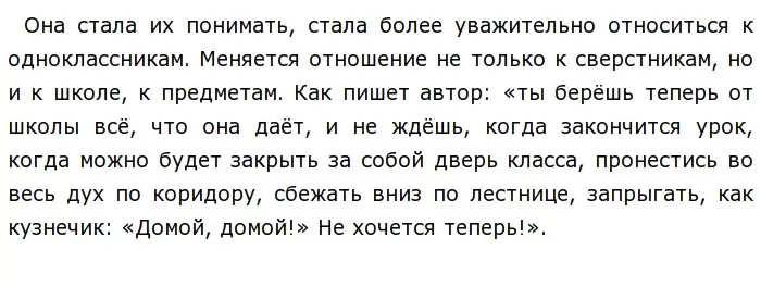 Я полностью согласна с мнением автора. Ведь сейчас я нахожусь в такой же ситуации. Мне также грустно прощаться со школой, меня даже охватывает страх перед новым, неизведанным. Я также заметила, что стала находить много общего с одноклассниками, мы стали дружнее в последние годы и это не может не радовать. Мы стали защищать друг друга, хотя раньше была некая борьба «кто лучше». Сейчас мы занимаем такое переходное положение, за плечами годы школы, а впереди взрослая жизнь. Мы становимся добрее, умнее, чутче в этот период, ведь осознаем, что это наши последние мгновения. Посредством этого мы становимся взрослее.
