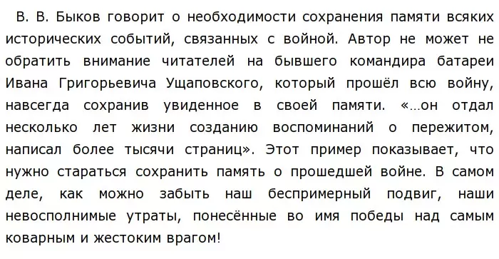 Рассуждая над данной проблемой, автор приходит к выводу: необходимо сохранять историческую память о войне. Человечество должно знать об участниках Великой Отечественной войны как можно больше информации, ведь все они совершили героический поступок, подарив последующим поколениям мирное небо над головой. В. В. Быков призывает тех, кто связан с литературой, с искусством, — помочь людям, пережившим войну, поведать о ней другим, ведь нельзя позволить человечеству забыть о военном времени.