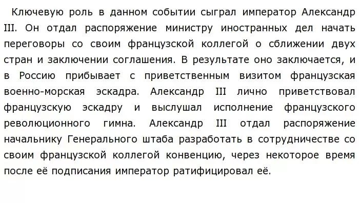 Одним из важнейших событий во внешней политике является заключение франко-русского союза. Причиной данного события было существование Тройственного союза, который имел антироссийскую и антифранцузскую ориентацию, что подтолкнуло двух государств к сближению и созданию оборонительного союза.