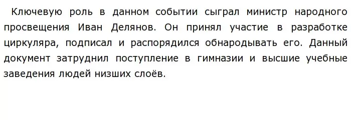 Другим важнейшим событием является издание циркуляра "О сокращении гимназического образования" в 1887 году для низших слоев населения. Причиной издания данного циркуляра послужило участие разночинской интеллигенции в теракте против Александра II.