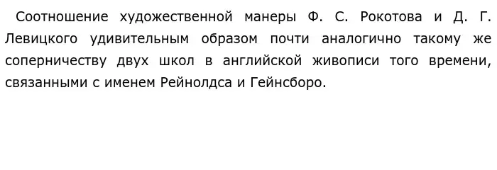 Полотна Д. Г. Левицкого также отличались мастерством исполнения и правдивостью характеристик (портреты А. Ф. Кокоринова, П. А. Демидова, Д. Дидро, М. А. Дьяковой и др.). Работы Рокотова более нарядны, ясны, виртуозны в технике, изящны по замыслу. Также великолепны его парадные портреты. Его работы во многом отличаются от Рейнолдса.