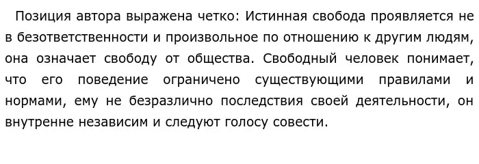 Трудно не согласиться с мнением автора. Действительно, свободным является такой человек, который не старается быть похожим на других, он осознает ответственность за свои поступки, поэтому не причиняет вред другим.