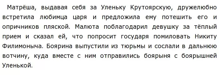 Чтобы привлечь внимание читателей к этому вопросу, автор рассказывает о событиях, которые происходили в доме боярина Крутоярского. Матрёша, наперсница боярышни Уленьки, изображая Мишку Топтыгина, веселила своих господ. Вдруг прибежал холоп и сообщил, что хозяина Крутоярского посадили в тюрьму, а за боярыней и её дочерью выехали опричники, которых возглавлял Малюта Скуратов, любимец царя. Только Матрёша не растерялась и быстро сообразила, что надо делать. Она одела своих хозяек и усадила их в кибитку, а сама надела на себя одежду и украшения боярышни Уленьки. Действительно, читаешь это и понимаешь, что Матрёша в опасной ситуации для своих хозяек сделала всё, чтобы спасти их от опричников.