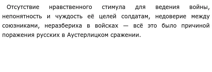 В романе Л. Н. Толстой осуждает бездарность командования, которое старается поставить себя в выгодное положение, приводит к гибели десятков тысяч людей. Ослепленные победами, занятые в основном самолюбованием, проводя военные смотры и балы, императоры России и Австрии привели свои армии к краху при Аустерлице. Лишь Кутузов прекрасно понимал это, и всячески старался перенести наступление. И только после указания государя Александра I, войска вступили в бой.