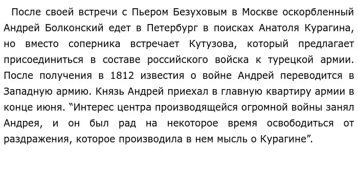 Николай Ростов участвовал в войне 1812 года. Перед открытием кампании он получил письмо от родных, в котором его просили приехать домой, но Ростов, считавший долгом чести защищать свою страну, объяснился, что не может этого сделать. Его устраивала его жизнь в полку, он сумел сделать ее приятной, а потому необходимость остаться на службе, в полку не была для него неприятным известием, он скорее был рад такому стечению обстоятельств и пребывал в таком настроении в начале военной кампании. Ростов участвовал в бою под Островно, где он, первым двинувшись в атаку, повел за собой эскадрон и разбил французских драгунов, тем самым спасши русских улан. И хотя за этот храбрый поступок Николай Ростов получил Георгиевский крест, он ощущал, что совершил что-то нехорошее, за что бывает стыдно и мучает совесть. Он и на следующий день думал о французе с дырочкой на подбородке, которого он ударил шпагой, – и не понимал, за что ему дали награду, разве он это делал для Отечества, ради своего государя? И в чем виноват пленный гусар? Ростов отрицает героичность своего поступка, он не понимает, по какой причине ему было необходимо убить его: “За что же мне убивать его?”. Он видит страх, овладевший этим французом, видит в нем себя, получившего ранение, во время Шенграбенского сражения, и, как мне кажется, осознает ту боль и страдания, которые приносит война.