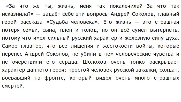 При первой встрече автор описывает его нам как простого мужчину из крестьянской семьи, а если быт точным, о об этом говорит сам Соколов. Высокий, сутуловатый мужчина с басом в голосе. На фронте его знали, как смелого, честного и храброго человека с несгибаемой волей. Однако Шолохов отмечает две очень важные детали: сухие, как дерево, руки и глаза, присыпанные пеплом, наполненные неизбывной смертной тоской. Сколько всего видел этот человек, что так сильно изменился за такое короткое время?