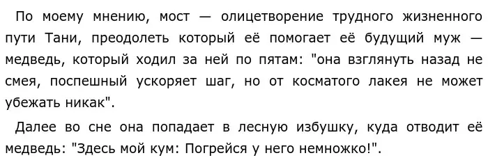 В эту же ночь ей снится странный сон. Сначала она "идёт по снеговой поляне", натыкается на "гиблый мостик", по которому боится пройти. Тут из-за сугроба появляется медведь, который протянул ей свою лапу и перевёл через ручей. Возможно Татьяна доверилась ему, потому что думала, что это Евгений.