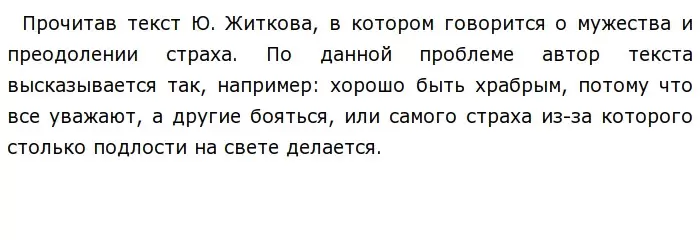 В своей жизни я видел мало проявлений настоящего мужества или страха, наверное это хорошо, это значит, что я везучий человек, но несколько примеров всё-таки найдётся. Первый пример про мужество: на моих глазах человек, который, как он сказал больше всего на свете боялся собак, разогнал целую стаю, чтобы спасти девочку, к которой они приставали; говорят, что от страха спасает его преодоление, но в этом случае он только усилился. Второй пример про страх: слышали, наверное, поговорку, что страх придаёт человеку крылья; случилось это, когда я убегал от быка, непонятно зачем за мной погнавшегося, никогда я так быстро не убегал, перелетел через трехметровый забор так, будто его и не было, и в конце концов избавился от преследования — вот отличный пример того, что страх может быть полезен. Страх — это обычное чувство для всех нас. Страх может быть и вредным, и полезным, может убить, а может и спасти. Мужество — это совсем другое, его нужно воспитывать, чтобы заместить им плохую сторону страха, это совершенно полезное свойство характера.