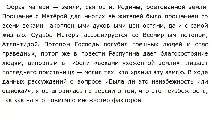 «Прощание с Матёрой» — это повесть, написанная Валентином Григорьевичем Распутиным в 1976 году. В данном произведении можно найти множество проблем, например, проблему памяти, смены поколений, тенденций общества и перехода от традиционного строя к индустриальному. Прочитав произведение можно подумать, что главным героем повести являются не столько люди, сколько сама Матёра, что, впрочем, отчасти является правдой, но только отчасти, ведь жители Матёры — это и есть то, из чего формируется её лицо, образ. Когда я впервые увидела название произведения, то у меня сразу создалась ассоциация с какой-либо женщиной, отошедшей в иной мир по какой-то причине. По ходу произведения мы начинаем понимать, почему Валентин Григорьевич Распутин дал такое название своей повести. Чтобы ответить на вопрос «Была ли гибель Матеры неизбежностью или ошибкой?», рассмотрим все самые значимые события и факты, так или иначе связанные с произведением. Для начала разберемся в названии самой деревни. Почему автор дал ей такое «человеческое» имя? Поискав информацию в интернете, я узнала, что имя Матера может обозначать как женское имя, так и метафорическое название родины. Также известно, что оно произошло от прилагательного «матерый», что значит опытный, закоренелый, достигший полной зрелости. В «Прощании с Матерой» мы видим, что деревня действительно старая, и что ей примерно 300 лет. Об этом нам говорит следующая цитата: "...Тот первый мужик, который триста с лишним лет назад надумал поселиться на острове, был человек зоркий и выгадливый, верно рассудивший, что лучше этой земли ему не сыскать...". Из всего вышеперечисленного можно понять, почему старые её жители так за неё держатся и проявляют недовольство, узнав новость о постройке новой ГЭС, из-за которой все село должно затопить осенью. Это их «маленькая родина», место, где все друг друга знают, место, у которого есть своя какая-никакая история. У многих жителей Матёры есть свои теплые воспоминания об этом месте, о их детстве, молодости и так далее. Большинству людей сложно принять смерть близкого человека, но в произведении