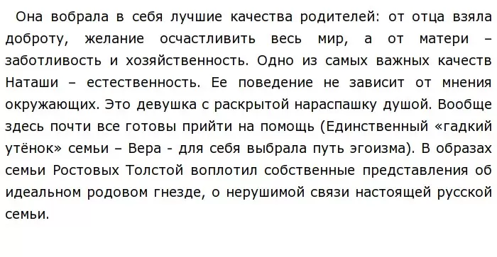 Самая образцовая семья романа – Ростовы. В их доме царит любовь и уважение, взаимопонимание. Глава – Илья Андреевич – московский дворянин, очень добрый и щедрый человек. Обожает жену и детей, всегда их поддерживает и помогает им.Одна из самых запоминающихся персонажей – Наташа.