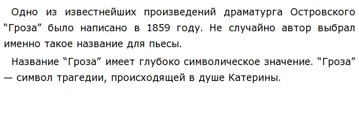 В “Грозе” драматург Островский показал серьезные изменения, происходящие в обществе в XIX веке, мастерски описав состояние общества через природную стихию. Он использует грозу как символ надвигающегося рока, от которого никто не может скрыться.