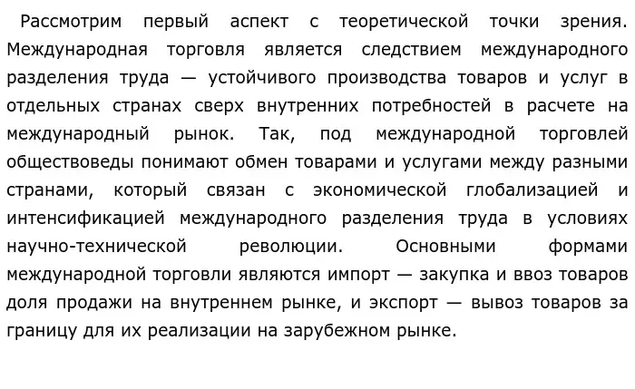 Рассмотрим второй аспект с теоретической точки зрения. Международная торговля несет за собой множество положительных последствий. Во-первых, торговля способствует развитию экономики, что поднимает уровень благосостояния страны, увеличивается престиж страны, улучшается уровень жизни населения. Во-вторых, благодаря международной торговле страны получают дефицитный товар, а взамен поставляют на мировой рынок товар, который находится в избытке. В-третьих, формирование устойчивых экономических связей. Так, международная торговля — это экономическое явление, которая при правильном подходе приводит к положительным последствиям.