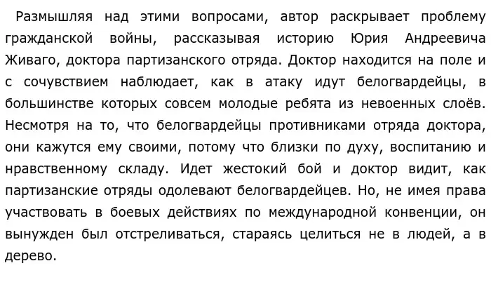 Гражданская война — это война между людьми одного государства. Но что же заставляет людей одной земли и родины противодействовать друг другу? Именно эту проблему поднимает Б. Л. Пастернак в своём произведении.