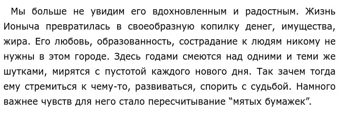 Никогда нельзя опускать руки и начинать просто плыть по течению. Чтобы обрести счастье, нужно бороться, иначе можно стать человеком без будущего, без личности, таким, каким стал Ионыч.