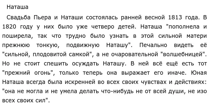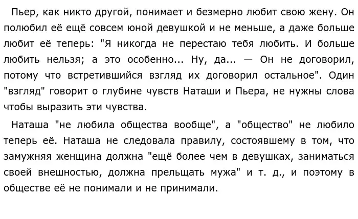 В семье Безуховых царит любовь и взаимопонимание. Так, Наташа "с широко раскрытыми, счастливыми глазами" разговаривает с мужем. В этом разговоре Толстой подчеркивает, что между супругами есть крепкая духовная связь, именно поэтому в их общении "последовательны и ясны не речи, а только чувство, которое руководит ими". Иногда Наташа злится на мужа за долгое отсутствие или ревнует его к светским дамам, но только рядом с ним она может быть по-настоящему счастливой. Денисов, который "с удивлением и грустью" наблюдал перемену в Наташе, наконец узнает её прежнюю, когда Пьер возвращается из Петербурга: "Яркий, блестящий, радостный свет лился потоками из её преобразившегося лица". Не понимая Пьера умом, она чутьем угадывала то, что было самым важным в его деятельности, разделала его мысли только потому, что это были его мысли, а он для неё — самый честный, самый справедливый человек на свете.