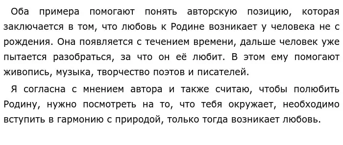 Размышляя над этим вопросом, автор приводит два дополняющих друг друга примера. Рассказчик пишет, что любовь к родине развивается в нас с детства, но осознание за что мы её любим приходит чуть позже, уже когда мы взрослеем. Солоухин заостряет наше внимание на том, что любовь к родине воспитано в нас литературой, музыкой, живописью. Огромную роль также сыграли поэты и писатели: Пушкин, Лермонтов, Некрасов, Толстой, Фет. Живописцы, изображая природу во всей её красоте, возродили в нас любовь к родине. Автор пишет: «…Поленов и Саврасов, Нестеров и Пластов - разве они не учили и не учат нас любить родную природу?» Я думаю, этим примером автор хотел донести до нас, что любовь к родине зарождается не только стихийно, но и благодаря людям, которые передают эту любовь через творчество.
