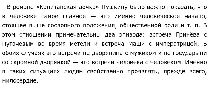 Исторический социально-бытовой роман А. С. Пушкина «Капитанская дочка» проникнут духом милосердия. В основе этого реалистического романа лежат мемуары пятидесятилетнего Петра Гринёва, посвященные восстанию Емельяна Пугачёва 1773 - 1775 года. Семнадцатилетнему Петру пришлось принять невольное участие в описанных событиях по «странному сцеплению обстоятельств». Главный эпиграф романа («Береги честь смолоду») отражает не только основную идею романа, но и взгляд самого А. С. Пушкина. В этом романе мы можем встретить важные для позднего творчества автора темы, например: нравственный выбор человека в сложных обстоятельствах, милосердие, народ и власть, а также «мысль семейная». Долг, честь и милосердие — безусловные нравственные ценности для Пушкина, которые иногда вступают в противоречие друг с другом. Как же это проявляется?