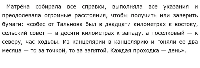 8. В приведённом фрагменте раскрываются такие черты характера Матрёны, как терпение, настойчивость и трудолюбие.