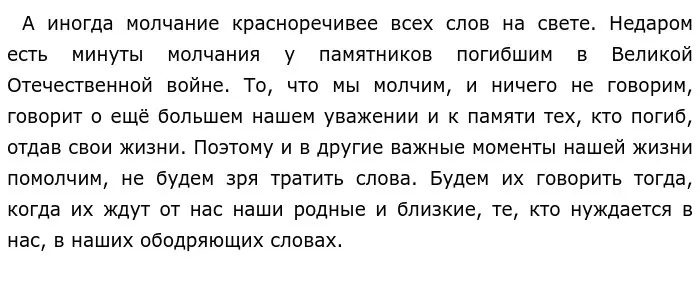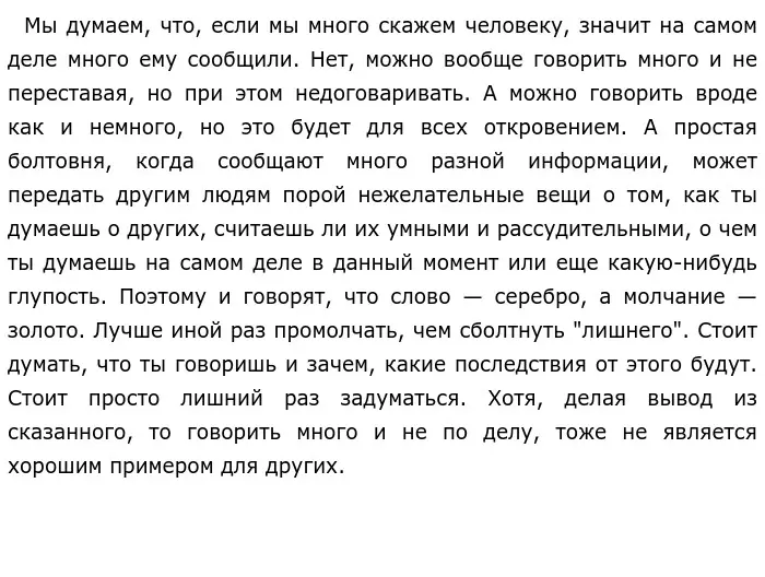 Мы порою много говорим и как бы не прислушиваемся к другим, нам важно, чтобы нас поняли и выслушали, но ведь общение не бывает односторонним, оно не идет в одном направлении. Все люди соединены тысячами нитей и разговаривая с ними, интересуясь их проблемами, расспрашивая их об их жизни, узнавая их горести, печали, а также радостные моменты, мы передаем другим энергию добра, которую несем в себе. Именно слова могут передавать эту энергию, и хорошо, если эта энергия положительная. Но как нам важно помнить о том, что необходимо внимательно следить за тем, как и какие слова мы говорим, что мы хотим этим сказать, какие чувства выразить. Слова должны нести людям радость и счастье, укреплять в нас веру в себя, звать нас к новым свершениям, помогать людям чувствовать надежду на улучшение своей жизни. Многие слова мы с детства запоминаем, и они на всю жизнь остаются нашими проводниками в жизни, это слова, святые для каждого человека: мать, Родина, долг, честь, доброта. Именно эти слова учат нас быть настоящими людьми и больше думать о других, чем о себе, но есть такие слова, которые для нас являются ненужными, они — хлам в нашей жизни. В этих словах звучит оскорбление другого человека и унижение людей, пренебрежение чужими интересами, открытая вражда. Гораздо лучше, если мы пользуемся словами, чтобы приободрить своего друга, успокоить грустного ребенка, и если наши слова помогли кому-нибудь почувствовать радость и улыбнуться, то такие слова и нужны на свете, если они приносят радость другим людям. Иногда нам случается и молчать, ведь наше молчание говорит за нас лучше, чем мы сами. Это ситуации, когда слова не нужны. В такие моменты мы делаем паузу, которая помогает нам вернее подобрать дальнейшие слова для нашего разговора и продолжить беседу.