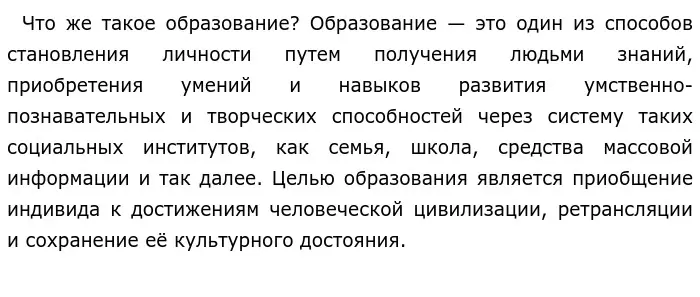 Но рассмотрим и другой пример: гражданин К всю свою жизнь учился чему-то новому, заводил интересные хобби, знал много иностранных языков. Его желание познать всё окружающее позитивно оценивалось не только близкими людьми, но и его будущим работодателем в крупной компании. Многогранность и широта взглядов делали К очень интересным и приятным собеседником, благодаря чему он заслужил уважение в обществе. Весь успех был достигнут с помощью непрерывного саморазвития и учебы К, что доказывает нам, как может быть полезно образование.