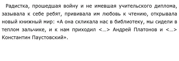 (2)Заведующая этой библиотекой, не имевшая учительского диплома, была истинным педагогом по душевной, нравственной своей сути. (3)Радистка, прошедшая войну, тяжело раненная под Кёнигсбергом, потерявшая в войну близких, знающая цену одиночеству людскому и горю, немногословная, угловатая... (4)В ней было живое любопытство к нам, нескладным подросткам послевоенного времени, «огольцам», топтавшимся по Чистым прудам, обменивавшим марки на трофейные немецкие ножички или пробки, роскошные альбомы с дрезденскими Венерами на зачитанный, без начала и конца драгоценный томик «Графа Монте-Кристо».