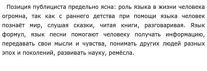 Чтобы привлечь внимание читателей к волнующей его проблеме, автор пишет о том, как язык повлиял на людей. Человек с самого рождения связан с языком: с детства слушает сказки бабушки и колыбельные мамы. По мере взросления он познает то, чего еще не видели его глаза, с помощью языка: читает книги, отражающие необъятную Вселенную, слушает своих учителей и «роднится с древними мыслями» людей (предложения 1-12) Язык с помощью слов способен передать любые явление, события, эмоции, будь то шум водопадов или бесконечный мир звездного пространства. Однако на этом размышления Л. В. Успенского о важности языка не заканчиваются. Публицист приводит в пример археологов, которые находят различные предметы древности, помочь разгадать которые могут только языковеды. Писатель утверждает: «Черепки были обречены на вечное молчание, если бы у нас не было языковедов». Отсюда становится понятно, что духовные, исторические и культурные ценности также хранятся в языке, благодаря изучению которого открываются многие тайны всего человечества.