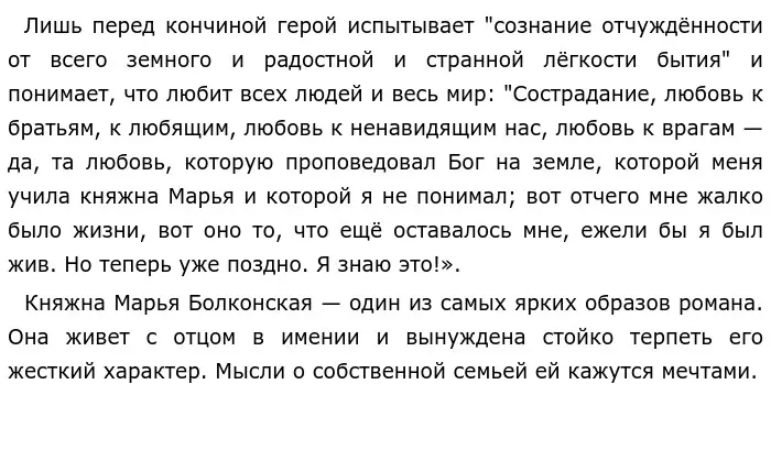 Князь Андрей Болконский во многом отличается от своего отца. Появляясь в самом начале романа, он проходит долгий жизненный путь, претерпевая различные изменения в характере и выступая правдоискателем. Оказавшись среди гостей салона Анны Павловны Шерер, князь Андрей выделяется на фоне других персонажей. Светская жизнь не приносит ему радости. Он жаждет отправиться на войну, сыскать славу, совершить подвиг, встретиться со своим кумиром Наполеоном. Но высокое небо Аустерлица изменяет его дальнейшую судьбу. Князь Андрей начинает поиски своего истинного предназначения. Сначала герой хочет жить для самого себя, затем встает на путь преобразований, занимается государственной службой. После этого он влюбляется в Наташу и намеревается жениться на ней. В итоге Андрей Болконский находит своё призвание в служение Отечеству, защите Родины от врагов. Однако 1812 оказывается фатальным для героя: в Бородинском сражении князь получает смертельное ранение.