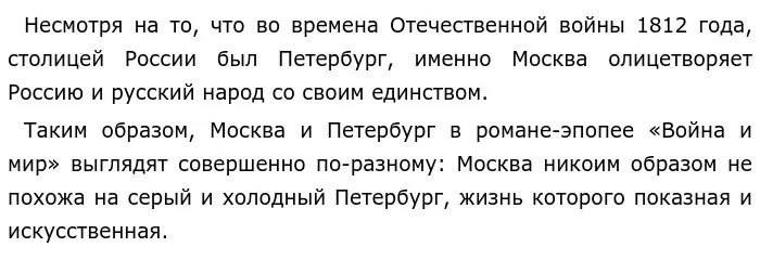 Л. Н. Толстой настолько грамотно обозначает разницу двух столиц, что читатель попадает в разные миры, где видит доброту, противопоставленную злу. В Москве все помогают друг другу в тяжёлые минуты, а петербуржцы думают только о себе и своём имуществе, им нет дела до чужого горя.